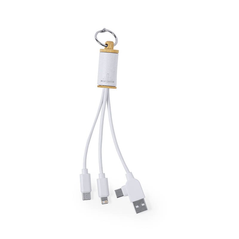 NOVINKA 2025. Charging cable made in combination of bamboo and recycled material from milk cartons. Includes dual USB/Type C connection + Micro USB, Type C and Lightning connections. With original transport ring and recycled milk cartons logo. Presented in an individual box in kraft design, with protective paper included. 5V DC 2.4A.Milk cartons are mostly made of cardboard and aluminum. During the recycling process, the different packaging materials are separated for reuse and re-purposing, thus contributing to the infinite path of the circular economy. This material is well known for its high recyclability, as well as for its lightweight and resistance.Materials such as bamboo encourage the use of natural raw materials, reducing pollutant emissions. It comes from a highly resistant and versatile plant with rapid growth and regeneration, making of it an excellent alternative to traditional wood.Manufactured according to RoHS standards, with blocking system to prevent short circuits.