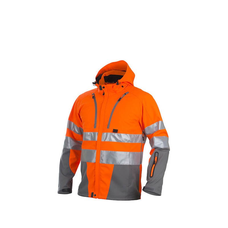 High visibility jacket in functional softshell fabric that is wind and water resistant. Quilted padded lining. Two breast pockets, left with inside phone pocket. Bracket for ID-card holders. Two inside zippered pockets including one larger for documents etc. Two side pockets. One sleeve pocket on left sleeve. Inside pocket with hole for hands-free on your left. Ventilation zippers under the arms. Drawstring waist. Adjustable cuffs. Extended back for comfort. Reflex Pass portals on the sleeves and back. Removable adjustable hood. Fleece-lined collar and side pockets for added comfort. Material: 100% polyester