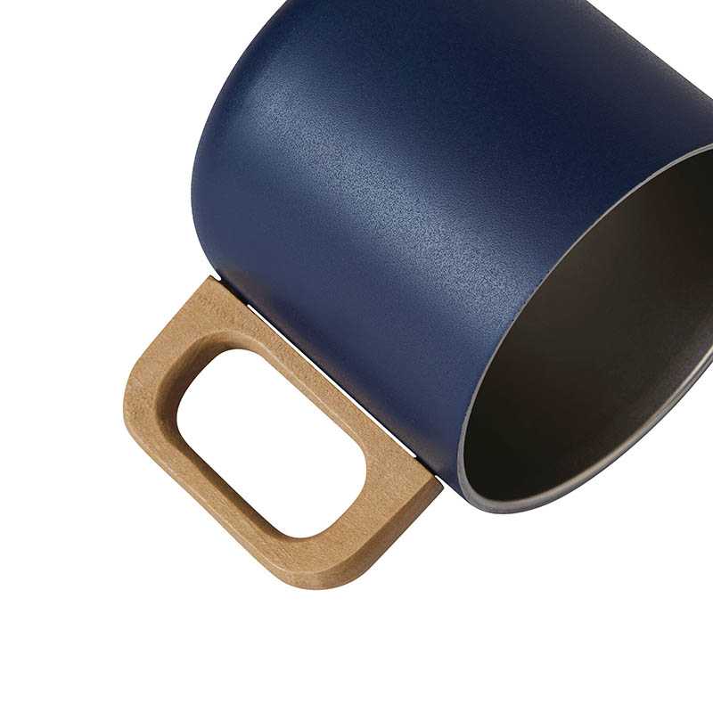 NOVINKA 2025. Cool double-walled mug with a capacity of 400 ml. Made of Recycled Stainless Steel, with wooden handle for a comfortable grip. With Recycled Stainless Steel logo and available in several colours. Presented in an individual kraft design box with paper protection.Steel is one of the most demanded materials and can be found almost everywhere, from everyday products to major constructions. With countless properties, including durability and a high level of reusability, it is a much valued alternative for sustainable solutions. Properly treated, new resources of infinite use can be obtained.