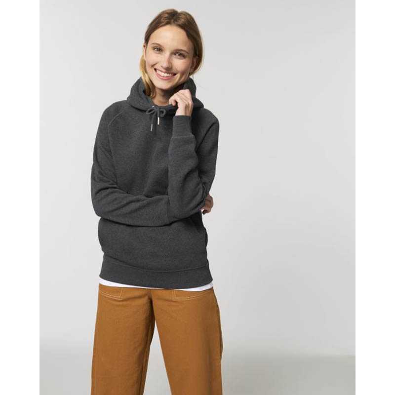 Bavlna s dlouhými vlákny. Kruhově dopřádaná bavlna. 3vláknitá tkanina pro hladký povrch. Dvouvrstvá kapuce. Žebrování s elastanem pro lepší stabilitu. Dvojité prošívání. Dvojité barvení. Česaná vnitřní úprava. Bez potisku lze prát při 60 °C