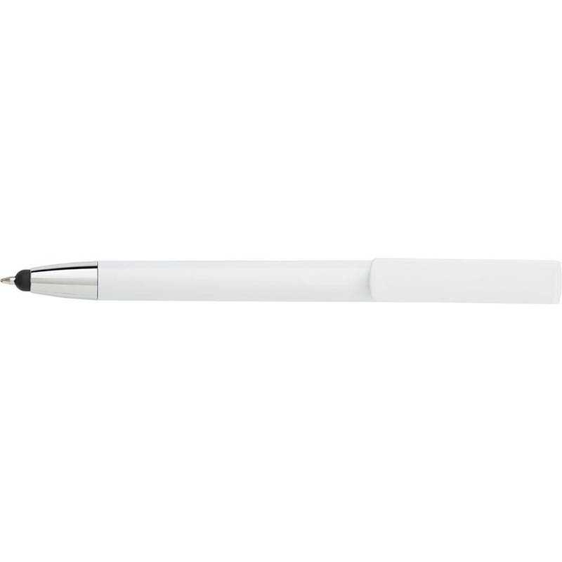 ABS ballpen with rubber tip suitable for capacitive screens and clip that doubles as phone stand. Blue ink.