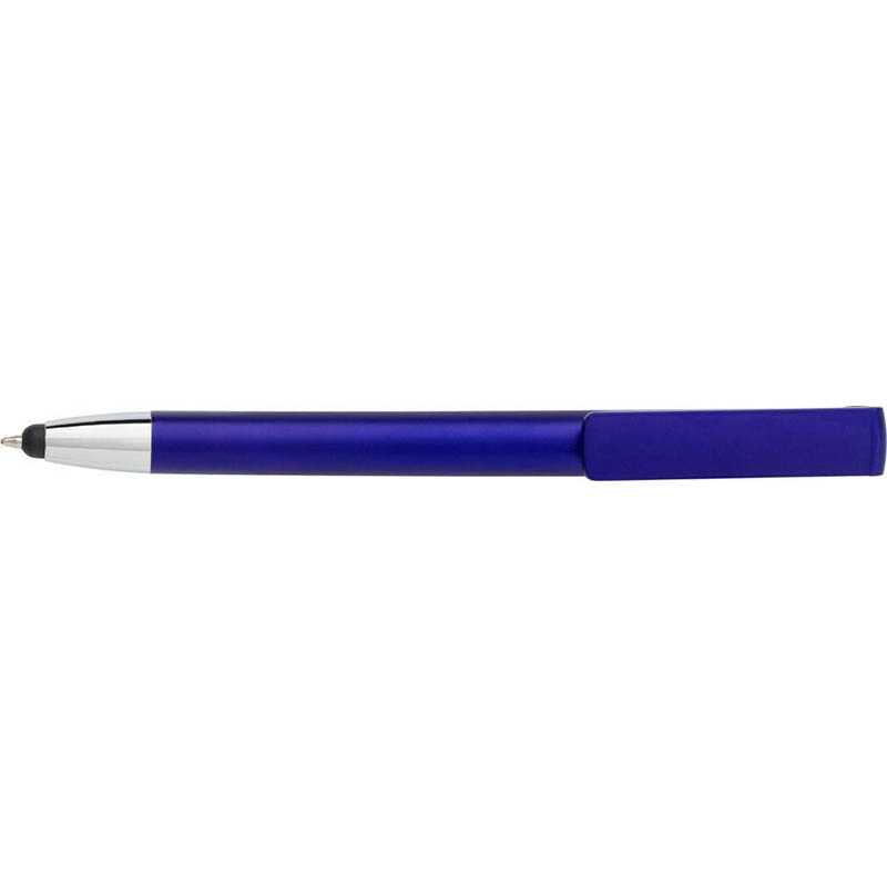ABS ballpen with rubber tip suitable for capacitive screens and clip that doubles as phone stand. Blue ink.
