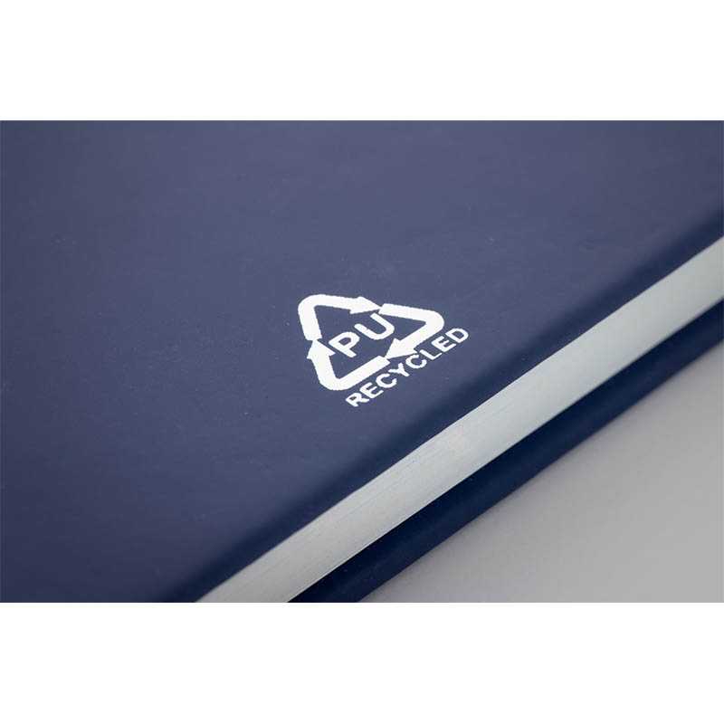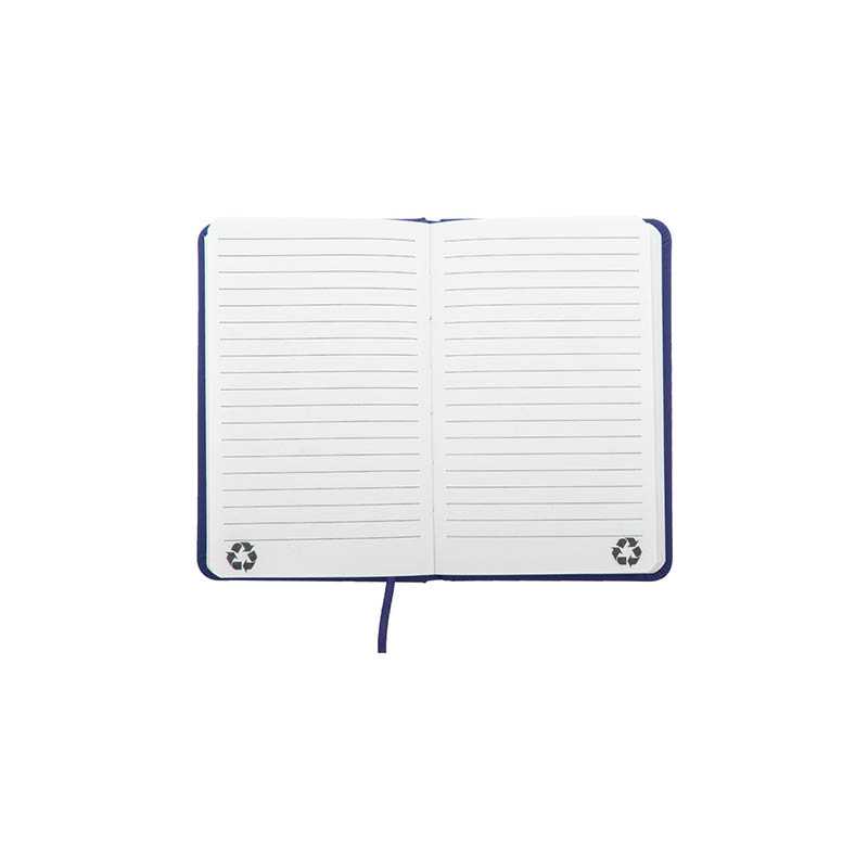 Blok potiahnutý recyklovanou PU kožou so 100 linkovanými listami z recyklovaného papiera. So záložkou v zodpovedajúcej farbe a gumičkou. Veľkosť A6.