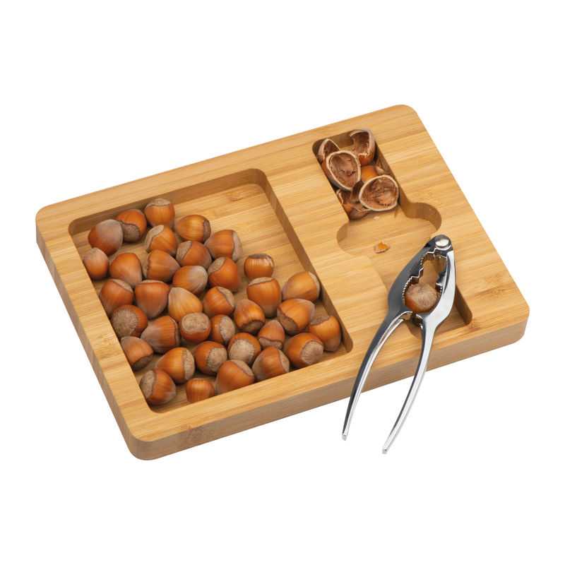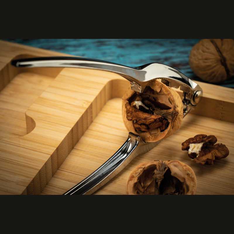Praktický kovový luskáčik na orechy so zladenou bambusovou miskou a priehlbinou na odpad.