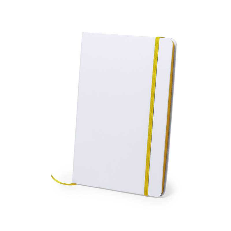 NOVINKA 2025. Notepad with rigid soft-touch covers in white. 100 plain sheets with side in fun colors, elastic band and matching color fabric bookmark.