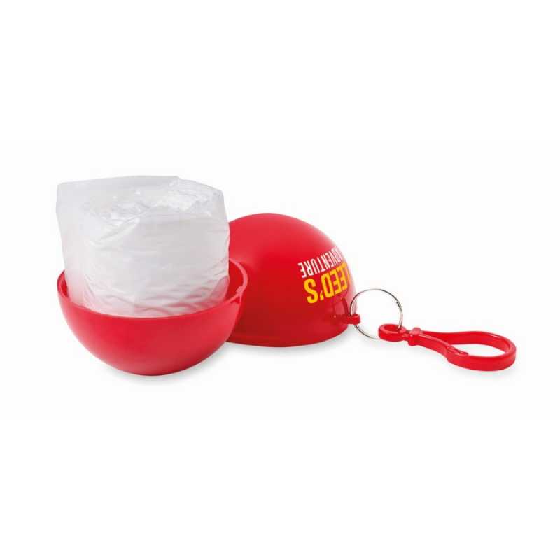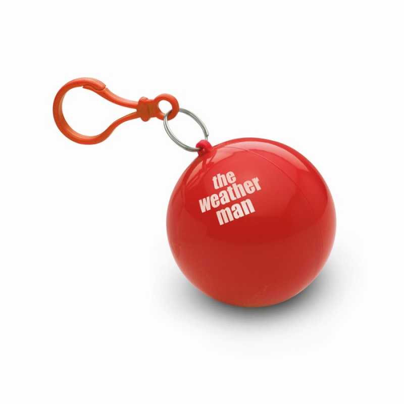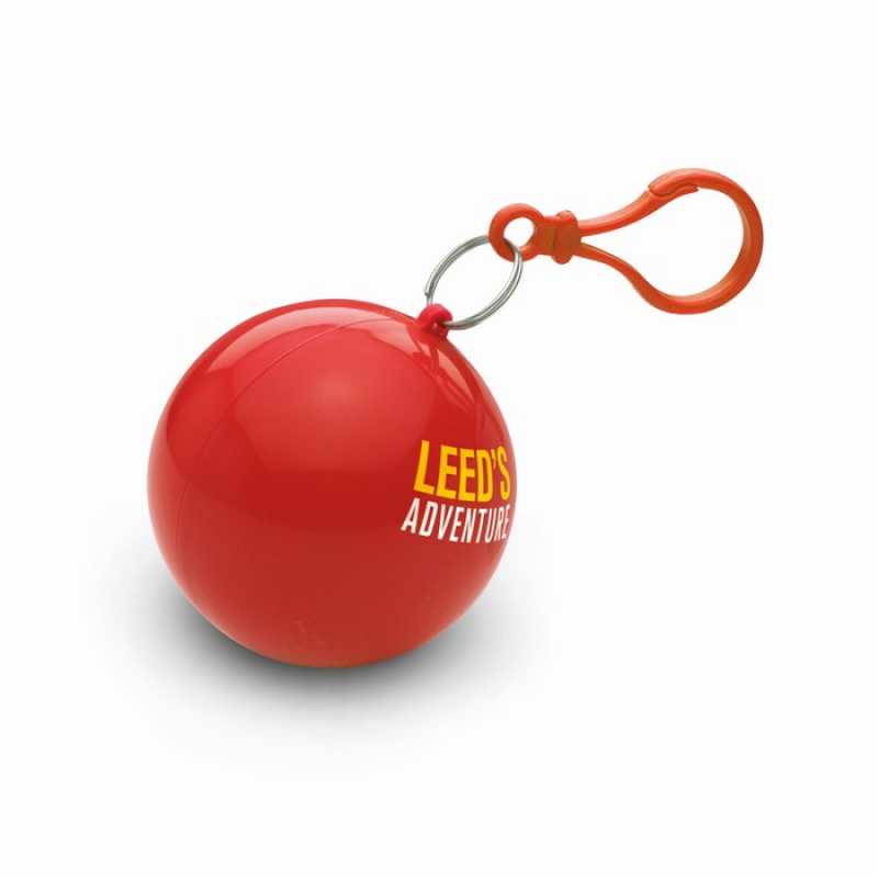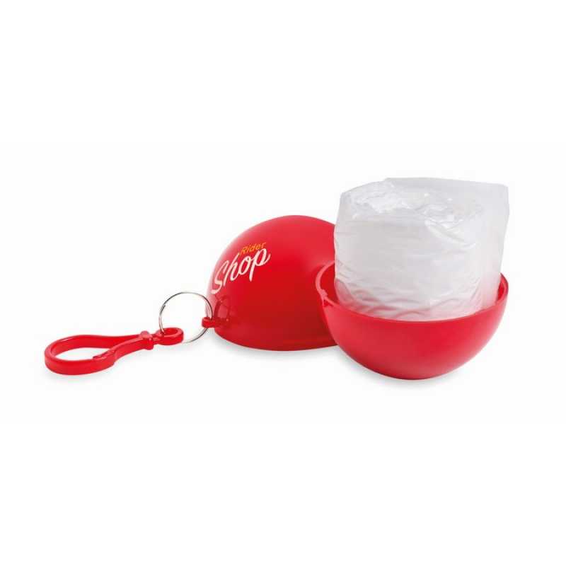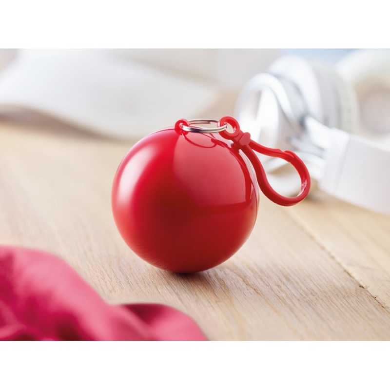 PVC Poncho in an ABS plastic ball with a snap hook attachment.