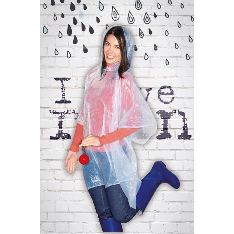 Transparentné LDPE pončo v jednej veľkosti pre dospelých. V RPET polyesterovom puzdre s výrazným štítkom RPET a hliníkovou karabínou.