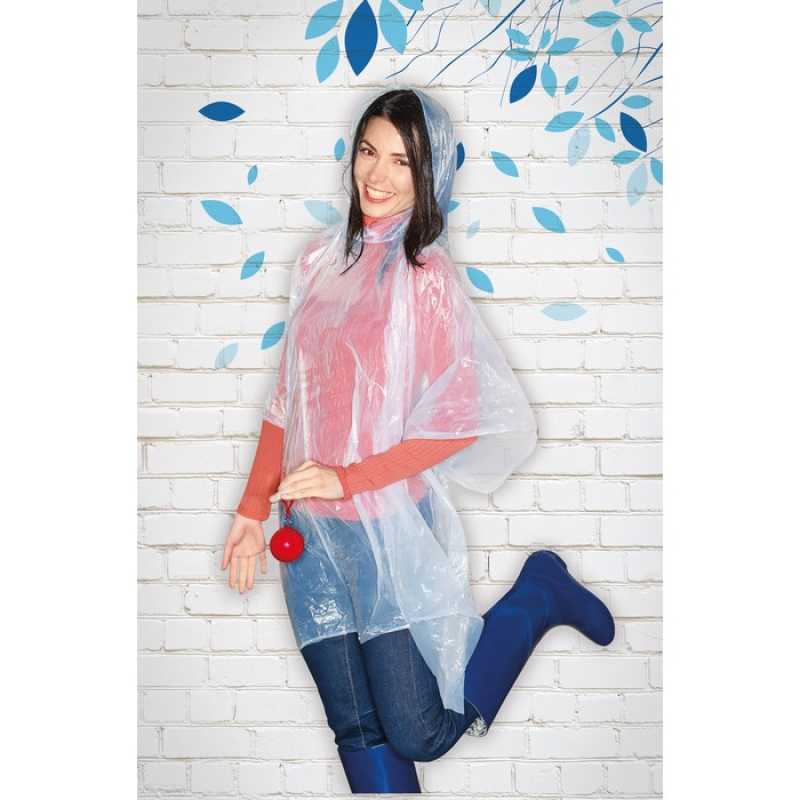Transparentní pláštěnka poncho z PE v ABS obalu s karabinou pro zavěšení.
