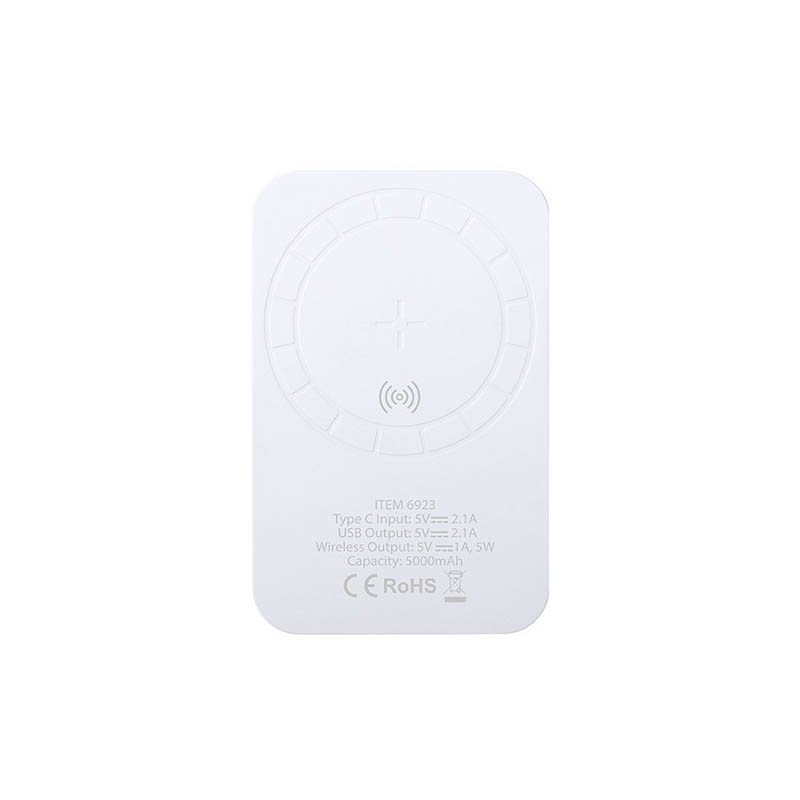 NOVINKA 2025. External auxiliary battery with high-capacity, wireless charging technology -5,000 mAh-. Compact design with magnetic mount allowing the device to be used while charging. Type-C power input and USB output connection, with Type-C charging cable included. ON/OFF button, charging status indicator LEDs and wide branding surface. Presented in an attractive design box, with instruction manual in English and Spanish. Includes adhesive ring, suitable for all devices with Magsafe and Qi technology.The capacities shown in all our external auxiliary batteries are real, all of them incorporating non-recycled, grade A batteries, with a service life of at least 500 charging cycles, and complying with CE regulations. In addition, they are manufactured according RoHS standards, and in compliance with the following safety requirements: Power bank overcharge protection system. Complete discharge protection system, which increases the durability of the power bank. Blocking system to prevent short circuits. Constant charging transfer system, in accordance with the capacity of the target device.