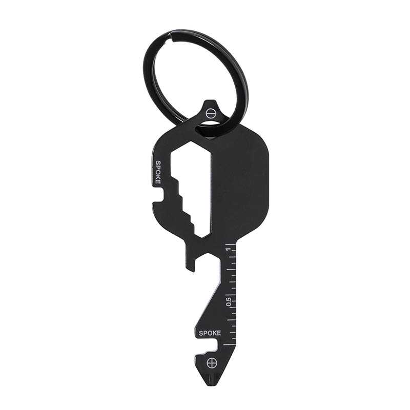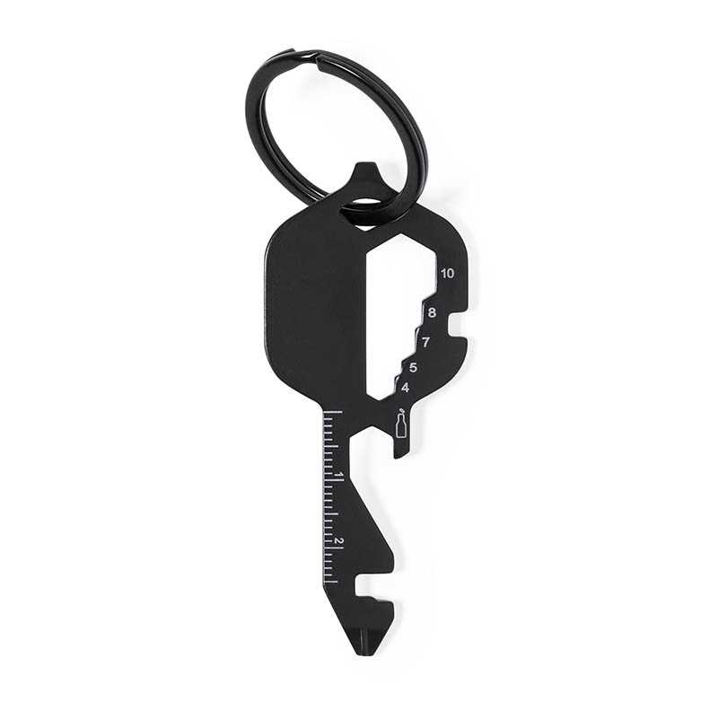 Viacúčelové náradie z kovu s karabínou. Súčasťou je plochý skrutkovač, pravítko, kľúč, rezač, otvárač na fľaše, krížový skrutkovač, pilník.