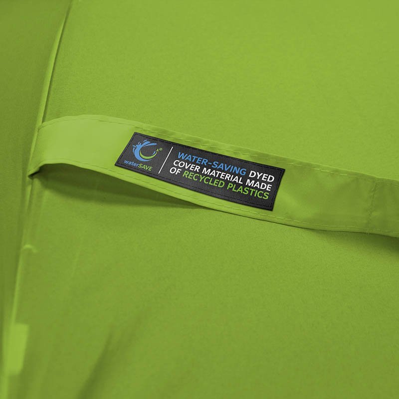 Easy to handle thanks to sliding safety runner, high-quality Windproof PLUS system for maximum frame flexibility in stormy conditions, polyester Pongee waterSAVE® cover material made of recycled plastics and dyed using a water-saving process, with waterSAVE® label on the closing strap (with new deliveries), wooden handle with promotional labelling option, sleeve with zipper can be used as a reusable shopping bag with compartment for the umbrella