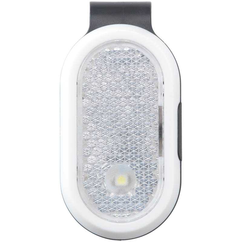 Reflector light with coloured clip. Two light settings: continuous bright white light or flashing red light. Incl. cell bateries.