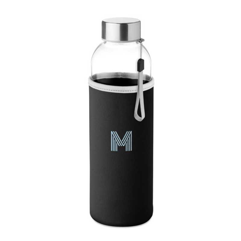 Glass drinking bottle (500 ml) with PS lid and silicone strap. Individually packaged in a brown cardboard box.