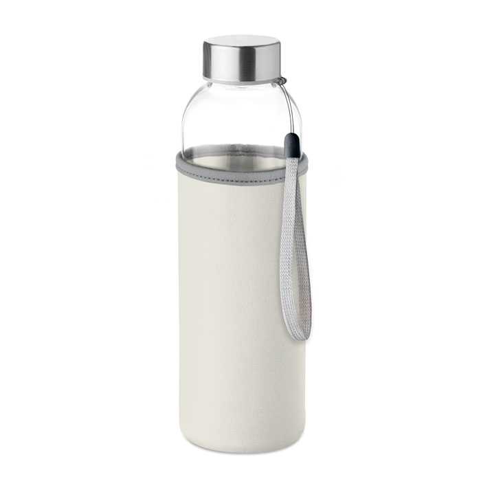 Glass drinking bottle (500 ml) with PS lid and silicone strap. Individually packaged in a brown cardboard box.