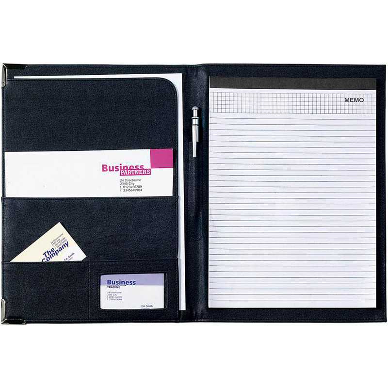 A4 PU conference folder. Notepad (item 8400) and pen not included. Colours: blue/silver gilt corners, black/gold gilt corners.