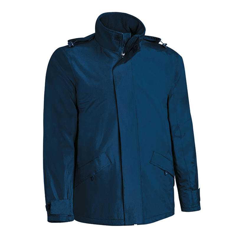 Waterproof Hooded Parka.Made of outer waterproof flat weave, smooth inner lining and inner quilting for ensuring excellent thermal insulation. Thermo-sealed seams that prevent water leaks and hidden hood that can be easily opened and closed by velcro closure and also can be used as a raincoat. Straight-cut waist with adjustable elastic drawstring and stopper, elasticated cuffs for a better fit and added comfort. Two front and two velcro flap chest pockets, an inner zippered left chest pocket for a secure and convenient storage, including a removable transparent badge holder on the left chest. Suitable marking methods: screen printing, embroidery, vinyl application.Ideal as workwear.
