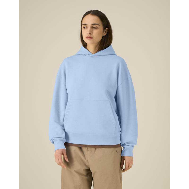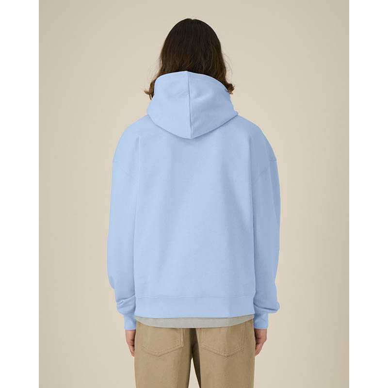 85 % organická bavlna/15 % recyklovaný polyester.Prstencovo spriadaná česaná bavlna.Rovný strih.3-vrstvový kartáčovaný flís, LSF (Low Shrinkage Fleece: predzrazený flís).1/2 kruhu vzadu.Klokanie vrecko.1 x 1 rebrovaný spodný okraj a manžety.Dvojité prešívanie na manžetách, prieramkoch, spodnom okraji a 1/2 kruhu.Podlepený výstrih vnútri na zadnej strane.Podšitá kapucňa z hlavného materiálu so zaväzovaním na šnúrku.Okrúhla šnúrka s recyklovanými kovovými koncovkami a očkami.