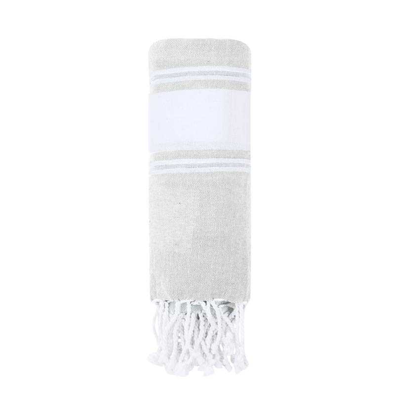 Plážová osuška s okrajmi, ktorú musíte mať pri každej návšteve pláže alebo bazéna. Materiál: 80% polyester / 20% bavlna, 110 g/m2