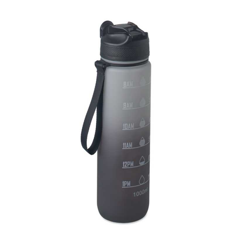 NOVINKA 2025. Sportovní RPET láhev na vodu s integrovaným brčkem, měkkým silikonovým náustkem, motivačním časovým značením, víčkem otevíratelným jednou rukou, bezpečnostním zámkem a popruhem na přenášení. Objem 1 l.