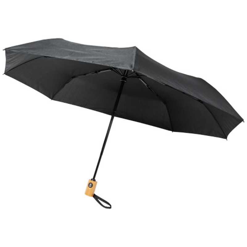 Deštník s automatickým otevíráním a skládáním s polyesterovou kupolí z recyklovaného PET ponžé. Odolná kovová tyčka, vysoce kvalitní rám s laminátovými žebry, které nabízí maximální flexibilitu ve větrných podmínkách. Dodává se v sáčku a lze jej snadno umístit do tašky nebo batohu pro pohodlné nošení. Společně s dřevěnou rukojetí a kupolí z recyklovaného PET polyesteru ponžé nabízí udržitelnou volbu. K dispozici v široké řadě moderních barev s velkou ozdobnou plochou na každém z panelů.