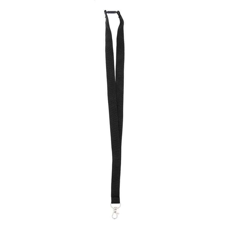 Lanyard made of strong woven polyester, with metal carabiner hook. The lower section is detachable using the quick release plastic clip.
