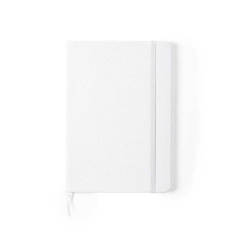 NOVINKA 2025. Notebook with hard covers made in RPET 600D. With blank front and back covers and 100 plain inner sheets. Elastic band and bookmark in a selection of vivid coloursm and especially designed for sublimation printing all around. With RPET logo on back cover and presented in an individual bag.RPET material is made from recycled plastic, thus promoting the reuse of plastic waste and helping the sustainability of the planet.