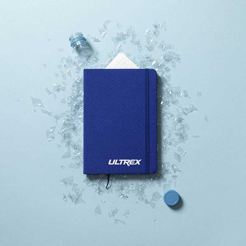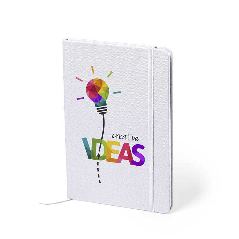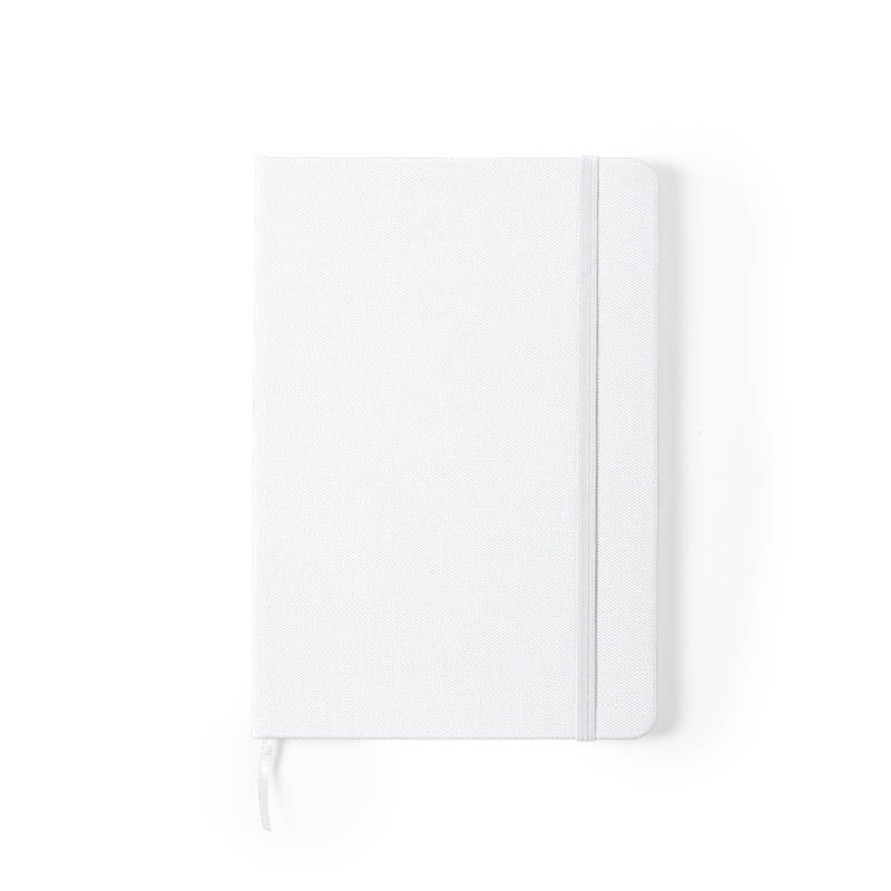 NOVINKA 2025. Notebook with hard covers made in RPET 600D. With blank front and back covers and 100 plain inner sheets. Elastic band and bookmark in a selection of vivid coloursm and especially designed for sublimation printing all around. With RPET logo on back cover and presented in an individual bag.RPET material is made from recycled plastic, thus promoting the reuse of plastic waste and helping the sustainability of the planet.