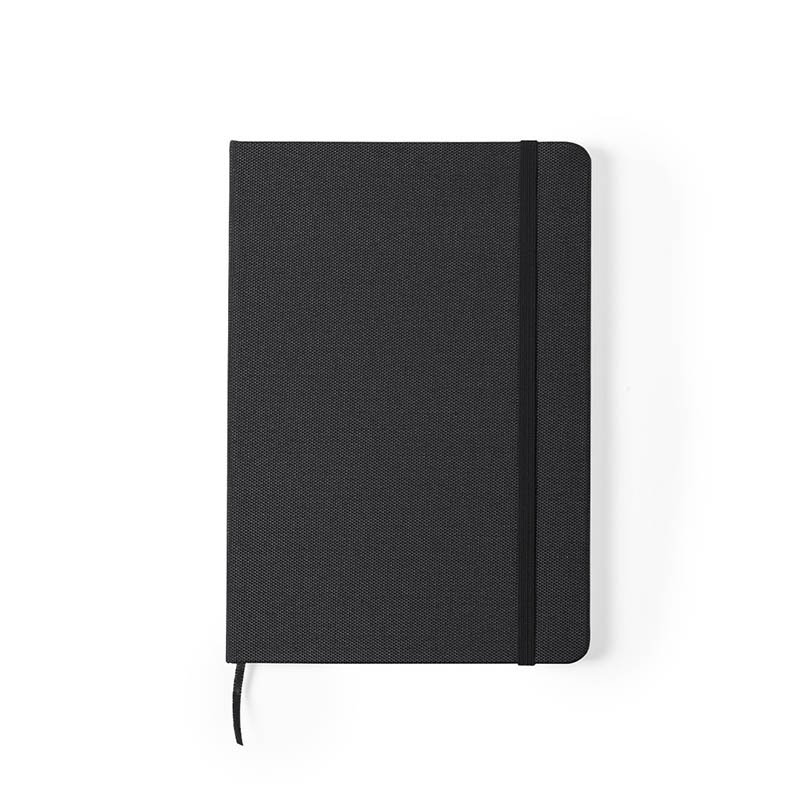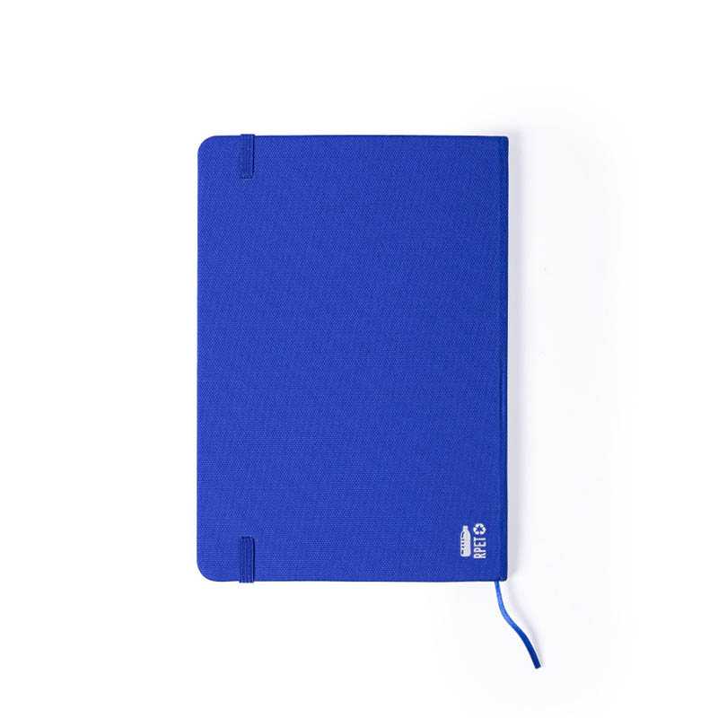 NOVINKA 2025. Nature line notepad with hard covers in 600D RPET, made from recycled plastic to encourage the reuse of plastic waste and contribute to the sustainability of the planet. Available in a wide range of colours, includes 80 single-stripe sheets. With elastic band and matching fabric bookmarks. RPET badge on the back.