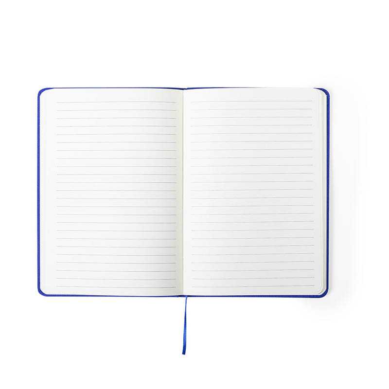 Zápisník formátu A5 s obálkou z imitácie kože a 192 linajkovanými stranami, farebnou značkovacou páskou, pútkom na pero a elastickou páskou na zapínanie.