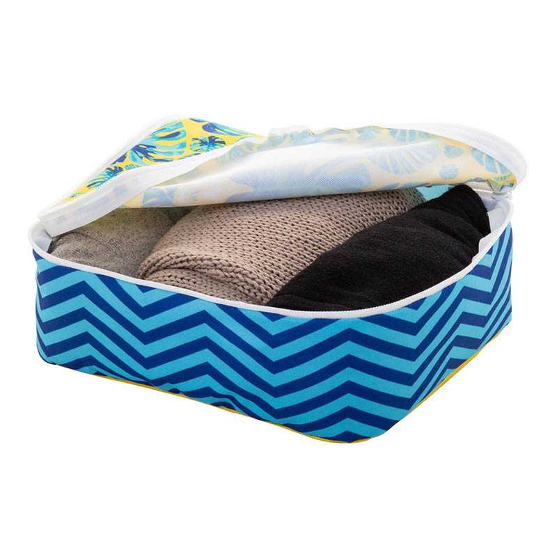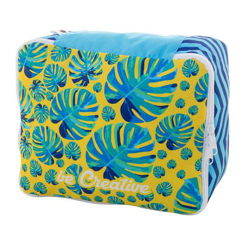 Na zákazku vyrobený organizér batožiny na zips z polyesteru 600D RPET. S celoplošne tlačenou sublimačnou grafikou a výrazným štítkom RPET. MOQ: 50 ks.