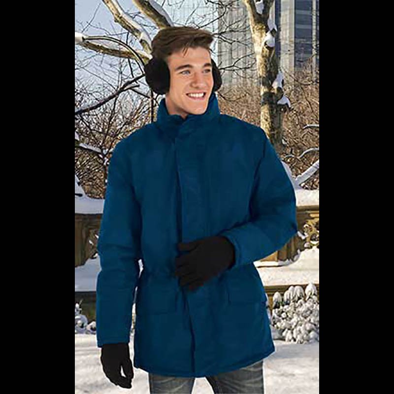 Outside 100% polyester 180 grs/m2 Otoman fabric with PU coating waterproof treatment. Padded 100% polyester 240 grs/m2. Hood with adjustable drawstring hidden in the neckband. Drawstring with stoppers on the bottom. Ribbed elastic cuffs. 2 flap lower pockets with zip. 1 inside left pocket. Waterproof heat-sealed seams. Heating system in 3 areas: left chest, right chest and lumbar. 10 units per box: 1 size. Individual bag.