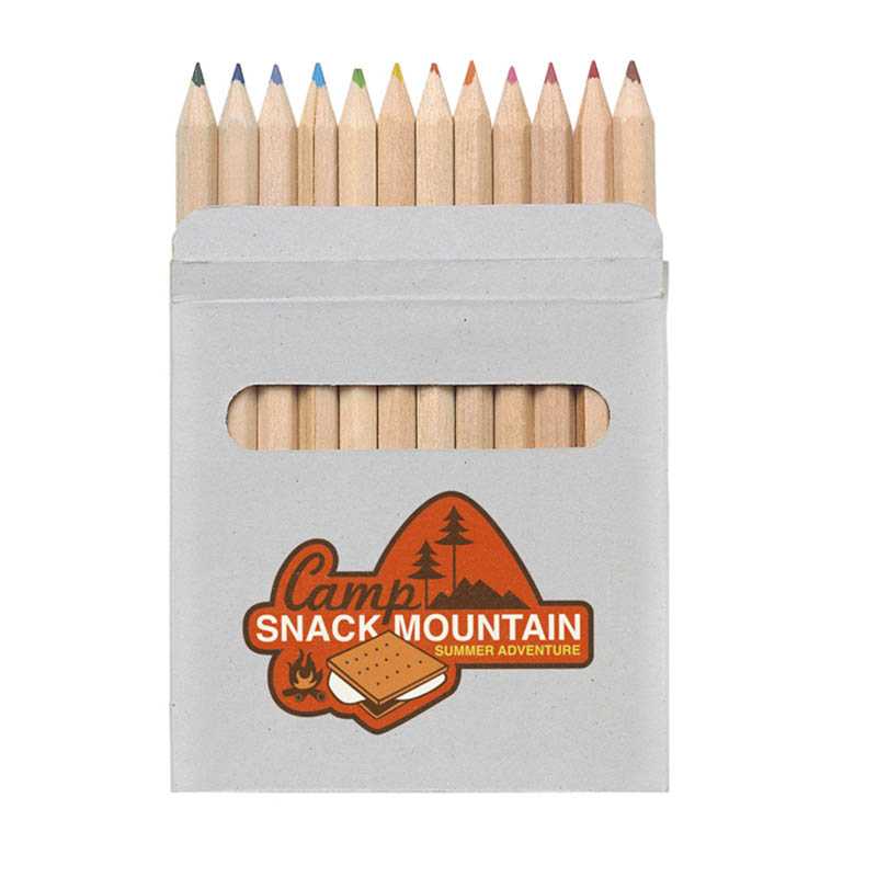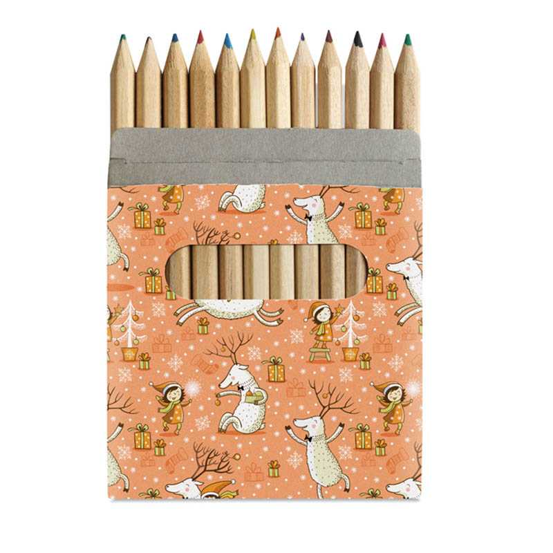 Kartónová krabička s 12 drevenými pastelkami. 90 x 90 x 9 mm