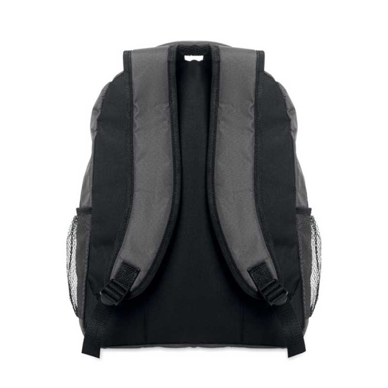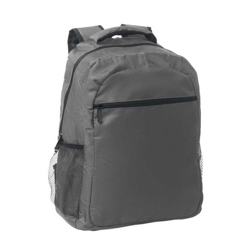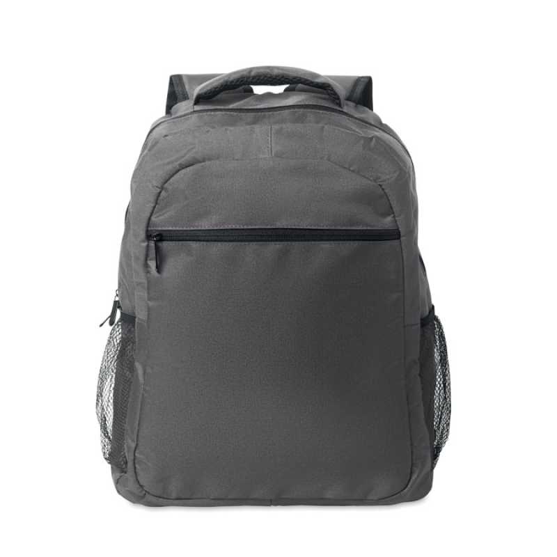 RPET polyester (600D) backpack. One compartment. One zippered front pocket. Colour detail on the top, black on the bottum. Carying handles on the top.