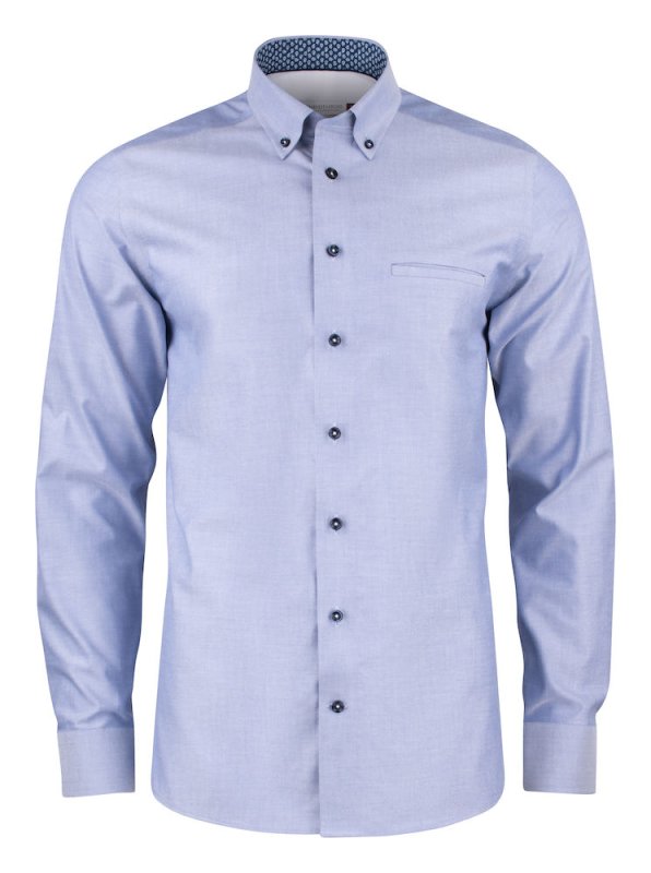 Product Name: Red Bow 120 Regular Product Number: 2912001 Product Fabrics: 100% twill cotton, long staple 2-ply. Compact cotton. Non-iron. Description: The perfect shirt for any occasion. With the characteristic indigo color, our famous non-iron fine twill fabric can remind you of a smart “jeans shirt”. It is set up with a tone in tone paisley contrast pattern in collar & cuff, and white details in placket & button tread. The typical Redbow line-shirt. Classical, yet detailed, giving the shirt a modern sophisticated look. Regular fit. • Red bow line. • Machine washable. • Non-iron patented environmental treatment. • Split back yoke ensures smooth contoured shoulders, and a greater range of motion. • Taped main-seams help the shirt look sharp and neat wash after wash. No wrinkles. • Semi cut away collar. • Long sleeve. Single angel-cuff, with extra buttonhole for cufflinks. • Tall, 4 mm-thick buttons give a substantial and modern feeling. • Curved hem.