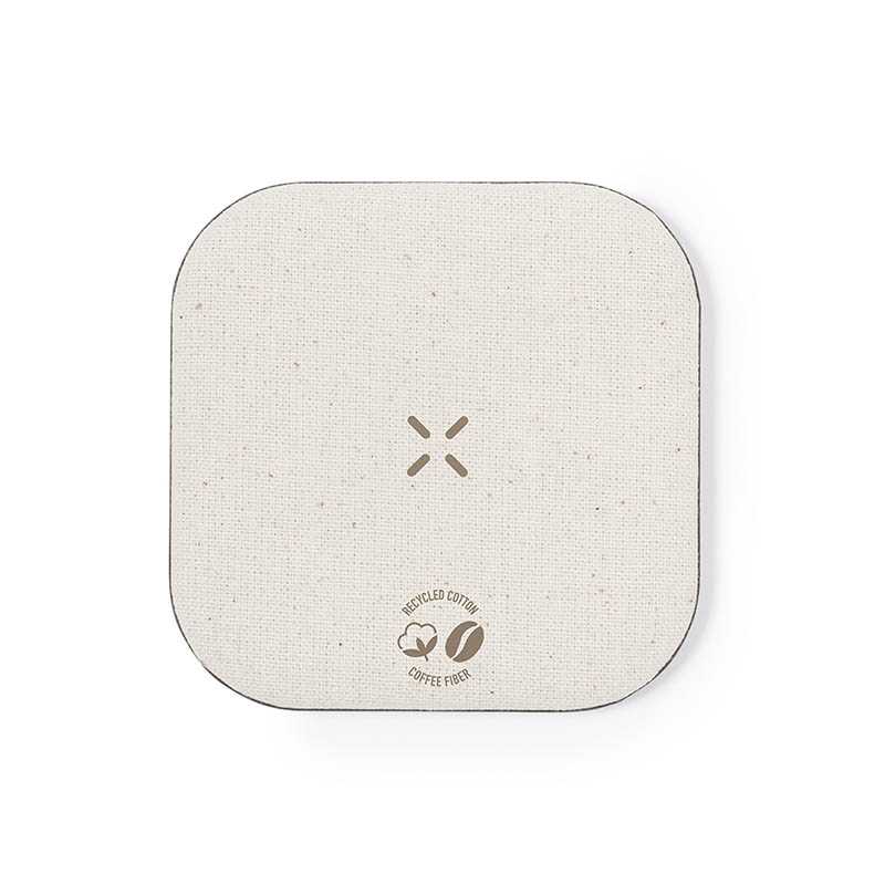 NOVINKA 2025. Wireless charger made of coffee fibre and recycled cotton. Non-slip base and compatible with devices equipped with Qi charging technology. Charging capacity of 15W, with Type C cable included in black color. Coffee fibre and recycled cotton logo. Presented in an attractive kraft design box, with instruction manual in English and Spanish.Coffee fibre is a circular solution that is obtained from the use of the waste produced in the production of coffee. A sustainable alternative that favours the reduction of the use of plastics, saving energy in its manufacturing process and contributing to the care of the environment. GRS (Global Recycled Standard) certification is available, which guarantees the recycled origin of the material used to manufacture the product.