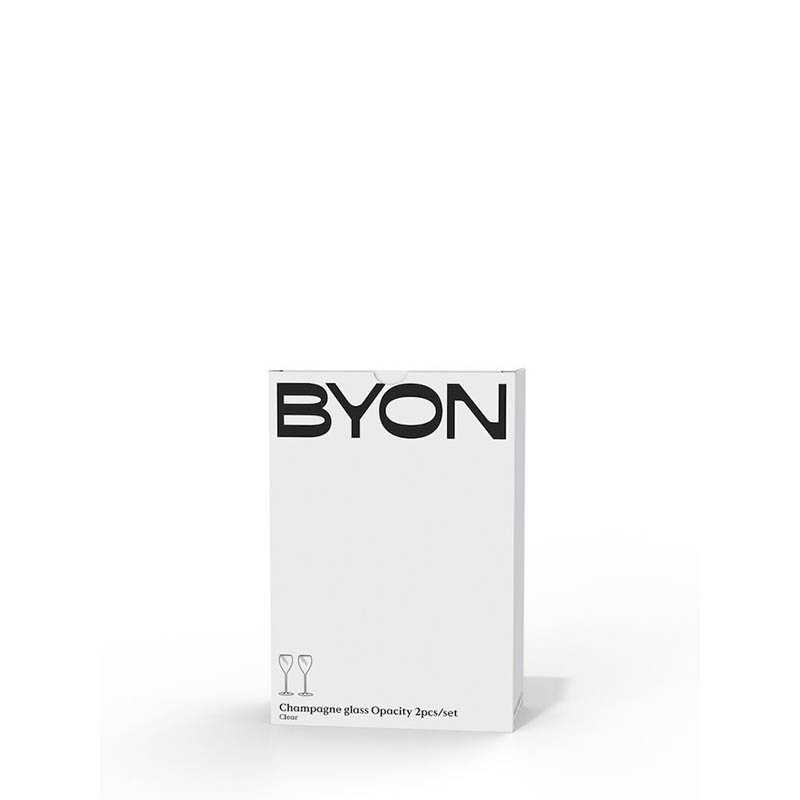 The Opacity champagne glass has been designed for a perfect experience - on the table, in the hand, and while drinking. It is a thin and delicate champagne glass with a beautiful glass pattern. The design strikes a perfect balance between luxury and boldness. Dishwasher safe. Designed by Byon Studio. Comes in a 2-pack in a Byon box. Material: glass Weight: 146 g Width: 65 mm; Height: 200 mm; Length: 65 mm; 16 cl Color: clear