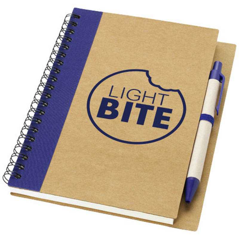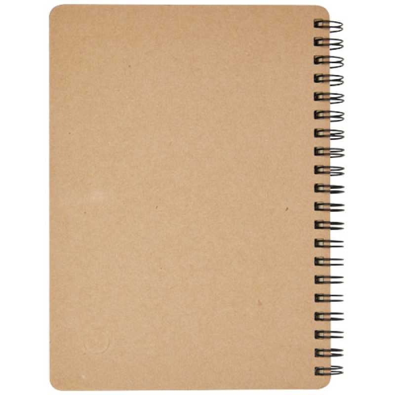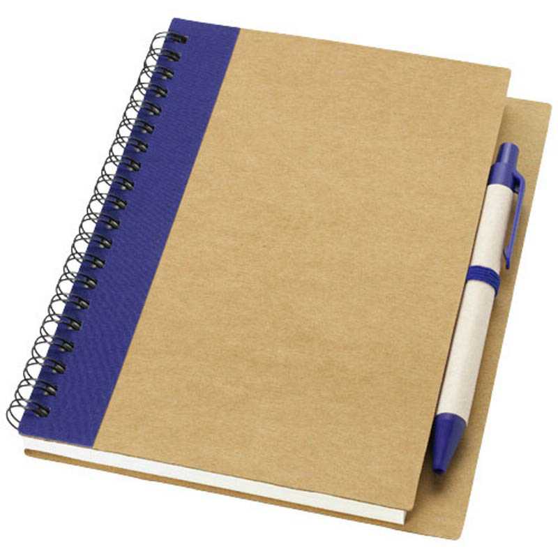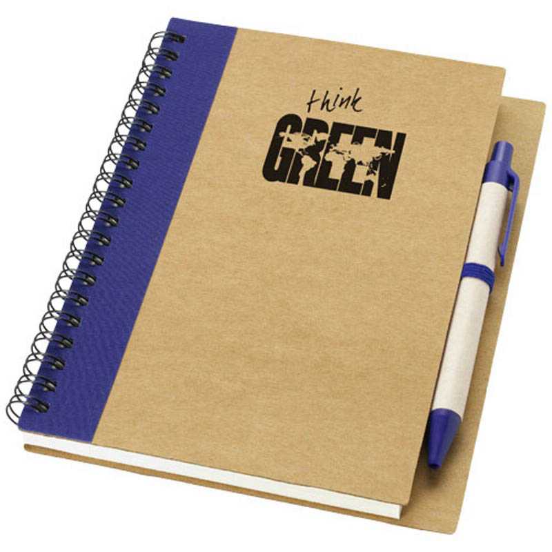 Recycled cardboard, wire bound notebook with 60 lined pages and ballpen with biodegradable parts and blue ink. 100% Recycled paper.