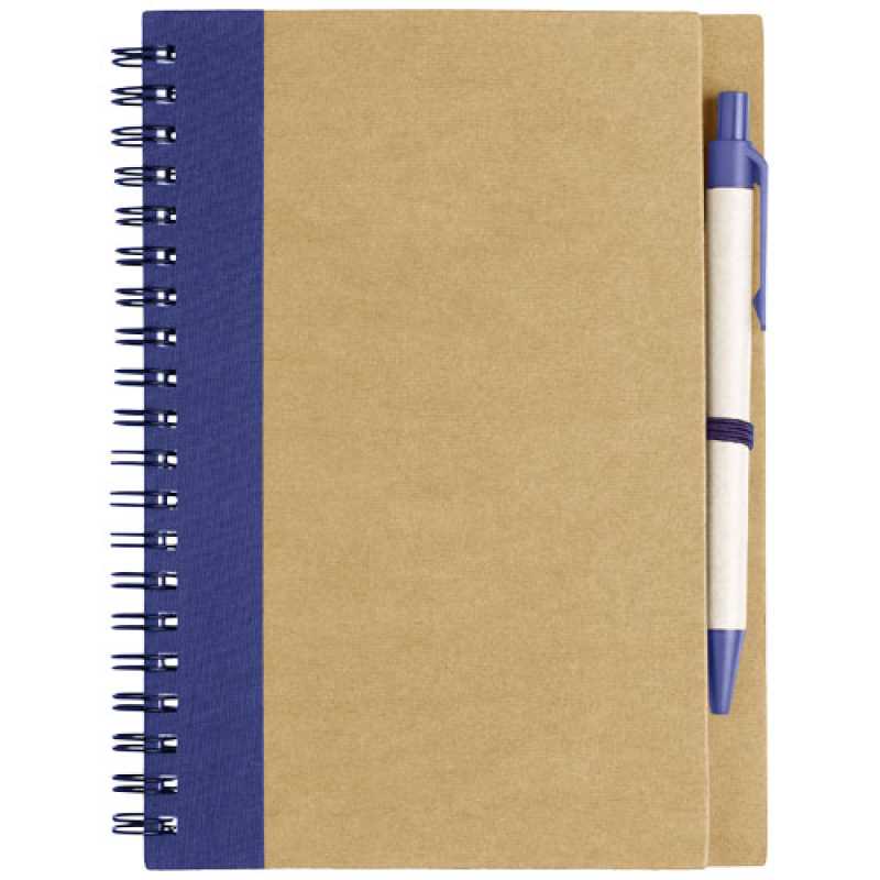 Kroužkový zápisník z recyklovaného papíru s propiskou. 140 stran recyklovaného papíru (70 listů) bez potisku. Odpovídající kuličkové pero v recyklovaném kartonu a biologicky rozložitelném plastu. Modrý inkoust. Elastické poutko na pero.