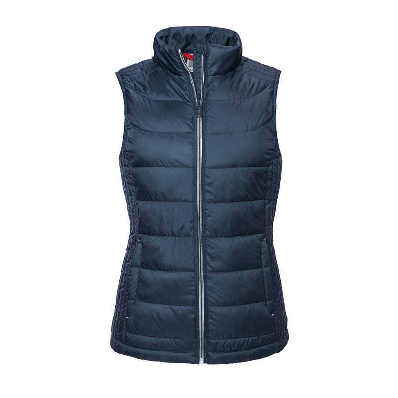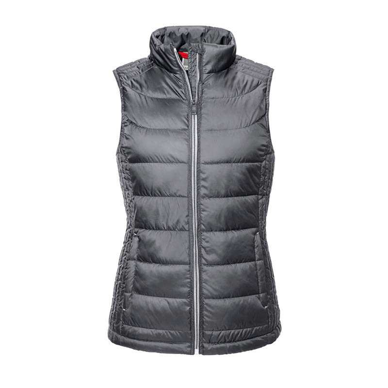 RUSSEL COLLECTION, This softshell gilet has set new standards for bodywarmers. Highly water resistant and windproof it is designed in a feminine cut, delivering on style and warmth coupled with freedom of movement. 3-layer softshell fabric with breathable membrane and bonded microfleece lining, water resistant to 5000mm. Značka : RUSSELL COLLECTION . Materiál : 92%PES/8%Elastane,340g/m2