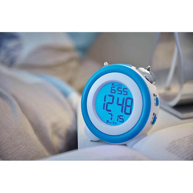 Alarm clock MODERN RETRO: with digital time and date display, two alarm times can be set, various alarm times for different weekdays possible, snooze function at five-minute intervals, blue background light, blue control keys at the sides