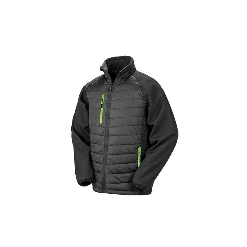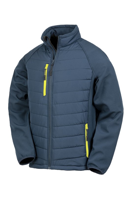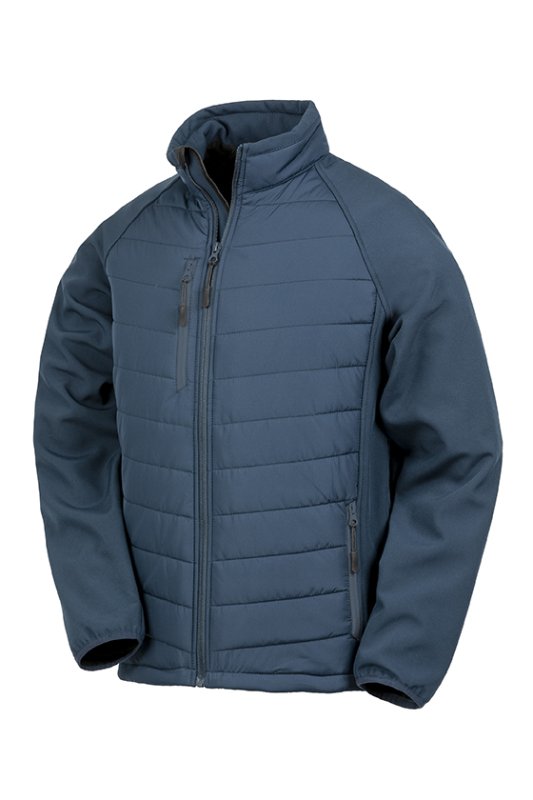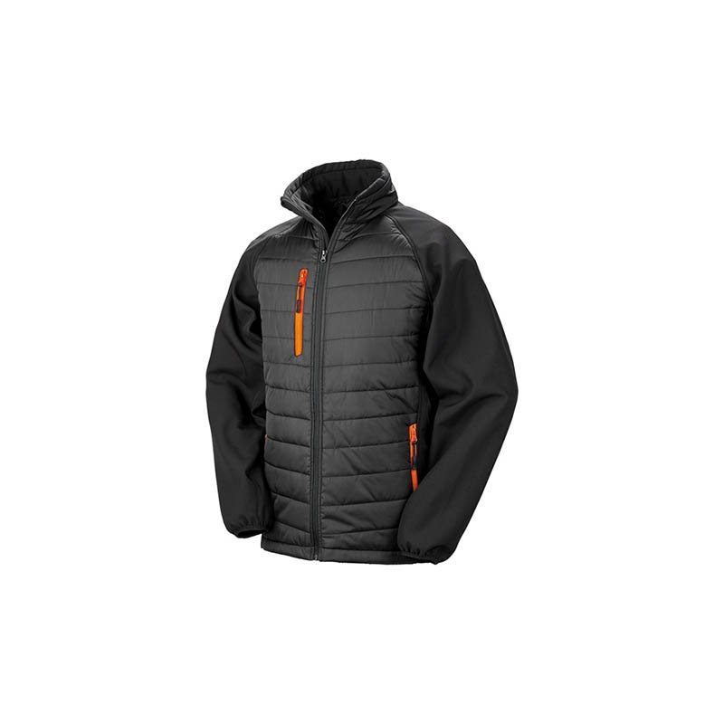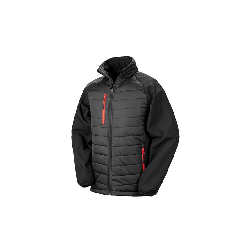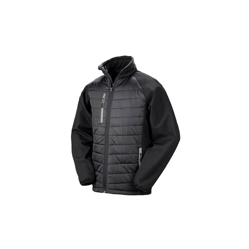 Contrast colour pocket zips Full front zip with chin guard Stand-up padded collar Padded body Soft bound cuff Hangtag On-trend padded + soft shell combination Super soft, lightweight & warm Printable soft shell sleeves Ready to brand Quiet to wear Black zip pulls