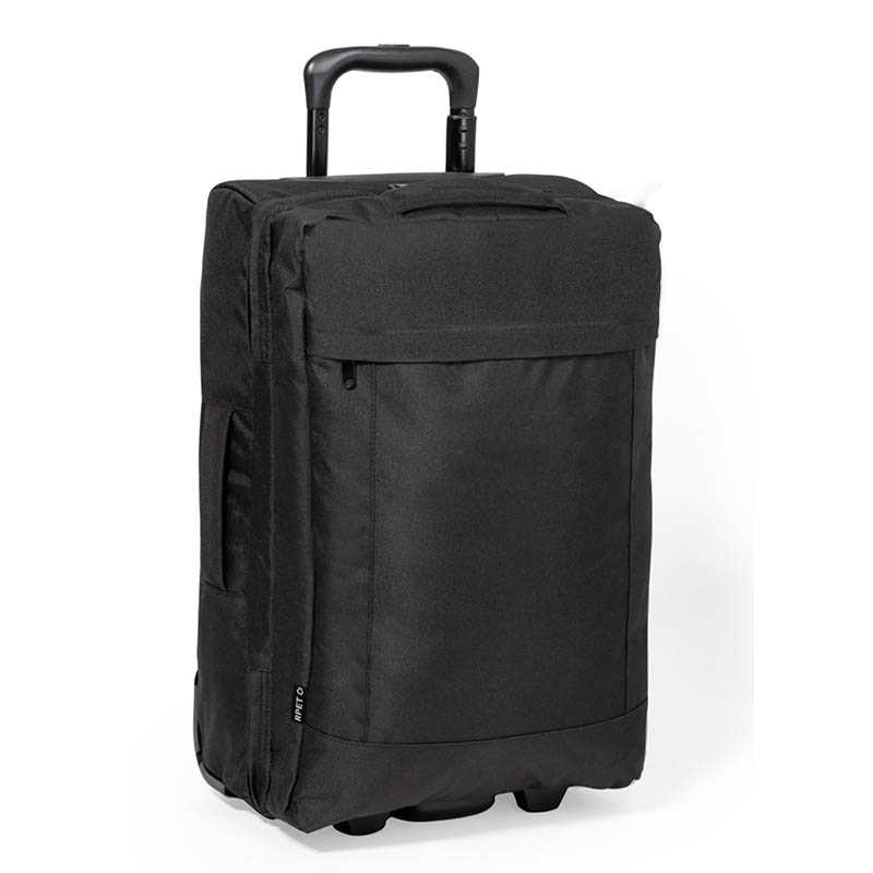 NOVINKA 2025. Trolley made of durable 600D RPET. Main compartment with TSA (Transportation Security Administration) compliant double pull zip, which allows customs authorities to inspect the contents of the luggage without having to force or break the lock, using a special key available to the authority.Lined interior plus organiser in the centre area. Outside with front pocket with invisible zip closure and 2 padded carry handles. Expandable metal mechanism in black, with comfortable carrying handle and 2 wheels. Outside RPET label.RPET material is made from recycled plastic, thus promoting the reuse of plastic waste and helping the sustainability of the planet.