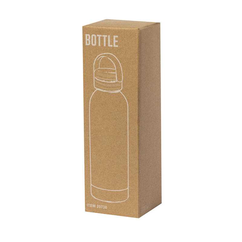Stainless steel (s/s304) bottle (500 ml) with a double wall and a plastic lid with bamboo look. Individually packaged in a brown cardboard box.
