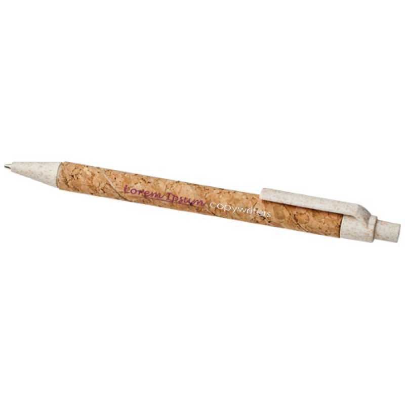 Ekologické kuličkové pero se stiskacím mechanismem, tělem vyrobeným z korku a doplňky z pšeničné slámy v různých barvách. Pšeničná sláma je zbytkový materiál po sklizni pšeničného obilí. Snižuje množství použitých plastů a nabízí tak ekologičtější alternativu. Barva korkového materiálu se může různit.