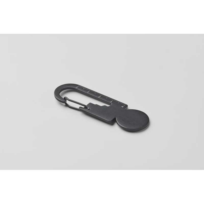 NOVINKA 2025. Multifunkční přívěšek na klíče z recyklované nerezové oceli (90 % recyklovaná nerezová ocel a 10 % nerezová ocel). Žeton do vozíku, otvírák na láhve, pravítko a šestihranný klíč 5,5 mm, 7 mm a 8 mm.