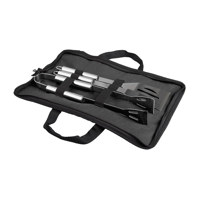 Stainless steel, four-piece barbecue set in a nylon zipper pouch with carrying straps. Including: a long brush, a tong, a meat fork, and a spatula.