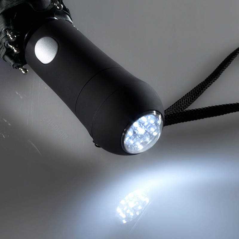 Convenient automatic function for a quick opening, high-quality Windproof PLUS system for maximum frame flexibility in stormy conditions, chromed steel shaft, cover with 3M™ Scotchlite™ Reflective Material at the panel corners as a trendy detail, Soft-Feel handle with LED light and promotional labelling option, light head (incl. battery) adjustable on continuous white light and flashing red light, Batteries (2 x CR2025) included in the scope of delivery. Further Safebrella®-umbrellas: 5071, 5171, 5471 and 7571.