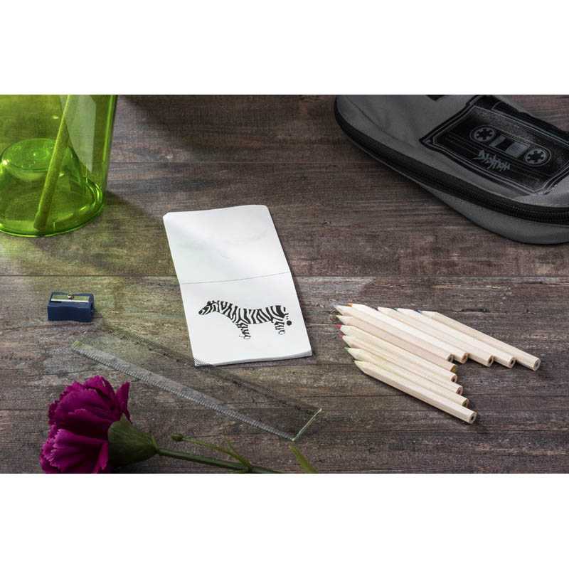 Komplet mladého umělce obsahující barevnou knihu, 10 dřevěných barevných tužek, pravítko a ořezávátko. Logo by mohlo být vytištěno na kartonu.