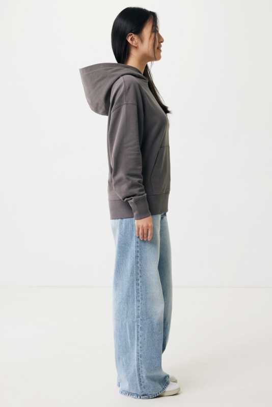 80 % organická bavlna/20 % recyklovaný polyester postspotrebiteľský.Oxfordská sivá 75 % organická bavlna/25 % recyklovaný polyester postspotrebiteľský.Francúzske froté LST (Low Shrinkage Terry).Tkanina: enzymaticky praná.Úzky strih.2 lemované predné vrecká.Kovový zips.Rebrované manžety, spodný okraj a podšitá kapucňa so sťahovacou šnúrkou v rovnakej farbe s kovovou koncovkou.Polmesiacovitá úprava pri výstrihu na uľahčenie prístupu k ozdobám zvnútra.Keprový podlepený výstrih.Žiadny štítok so značkou pri krku, len štítok s veľkosťou na jednoduchý prístup k ozdobám.Certifikát STANDARD 100 podľa OEKO-TEX®N° CQ1007/8, IFTH.