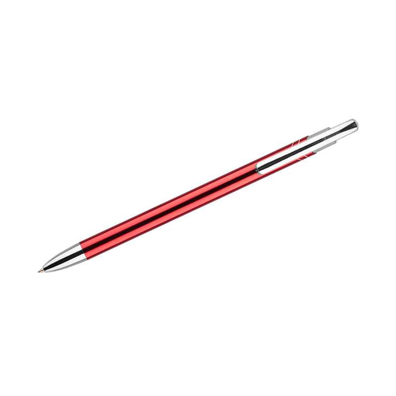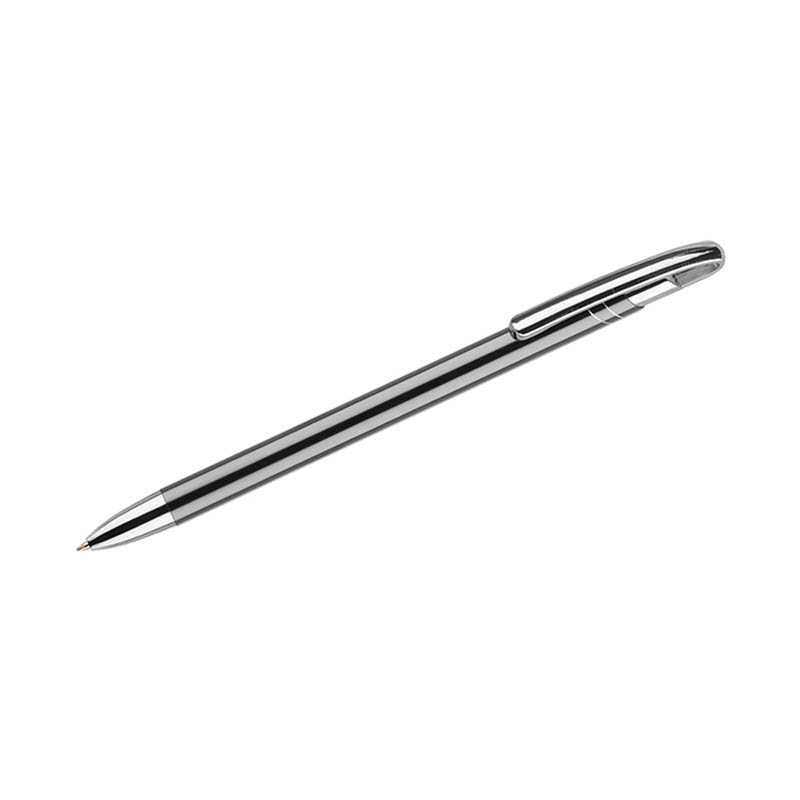 Tenký a hladký kovový pero s metalickým povrchem. Sponka a špičky v stříbrné chromové úpravě. AVALO se od ostatních podobných per odlišuje originálním designem sponky. Válec je ozdoben dvěma skloněnými stříbrnými pruhy. Modrá náplň o tloušťce 0,7 mm.